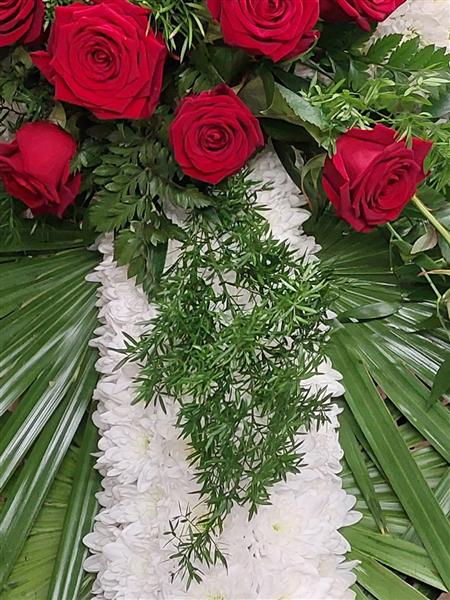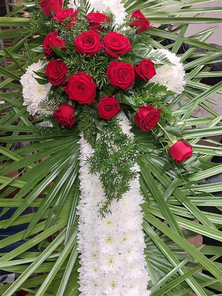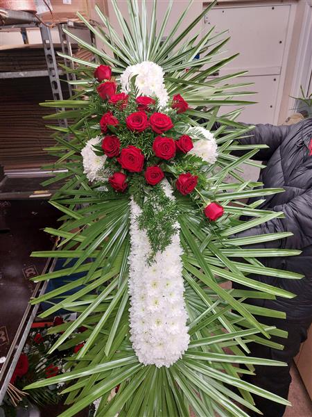 A cross with palm foliage edge.Please Specify the colour of the sprays of flowers on the cross Standard cross is 4 foot, with palm leaves making the overall show bigger. Large is a 5 foot cross.