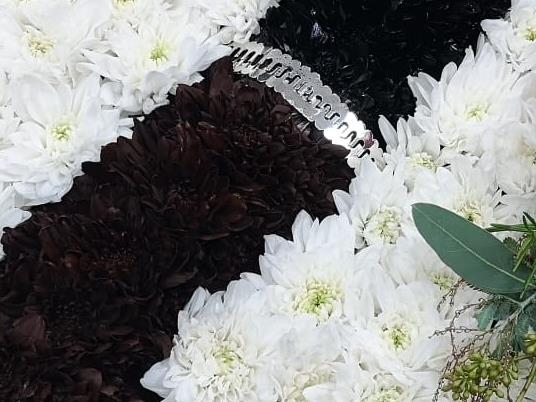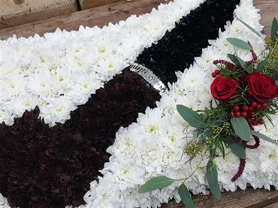 At this price the tribiute is around 2 foot across. Please specify the colour of the little sprays of flowers.