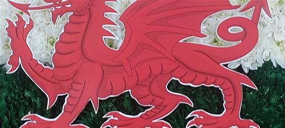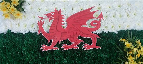 A Welsh flag, with a flower base, red printed Dragon and silk Daffodils- Fresh Daffodils will be used if in season. for this price the tribute is around 24 inches across.